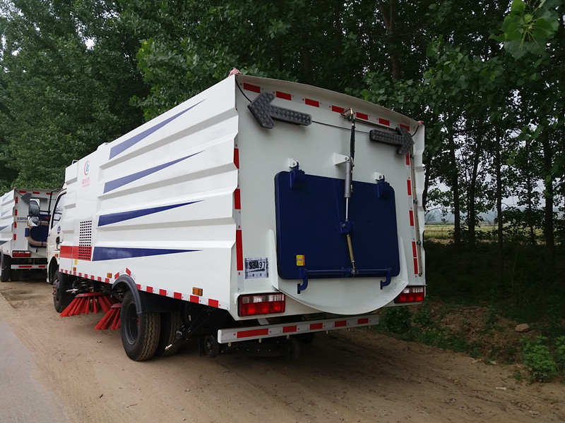1.采用吸掃混合的方式收集垃圾,濕式除塵,電液控制,液壓傾翻卸料的作業方式對路面進行清掃作業。