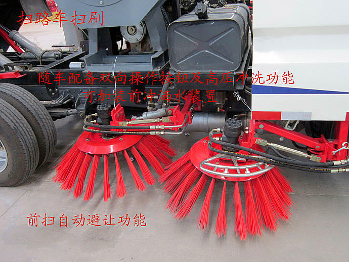 3.中置四掃盤+進口液壓馬達驅動,穩定可靠,前掃盤有噴霧壓塵系統,掃盤遇障防碰撞自動防避讓功能及復位功能,掃刷臂轉動機構使用高新耐磨工程隔套;掃盤轉速可根據各種不同清掃路況,調整轉速,能保證在各種污染狀況下都有良好的清掃效果;